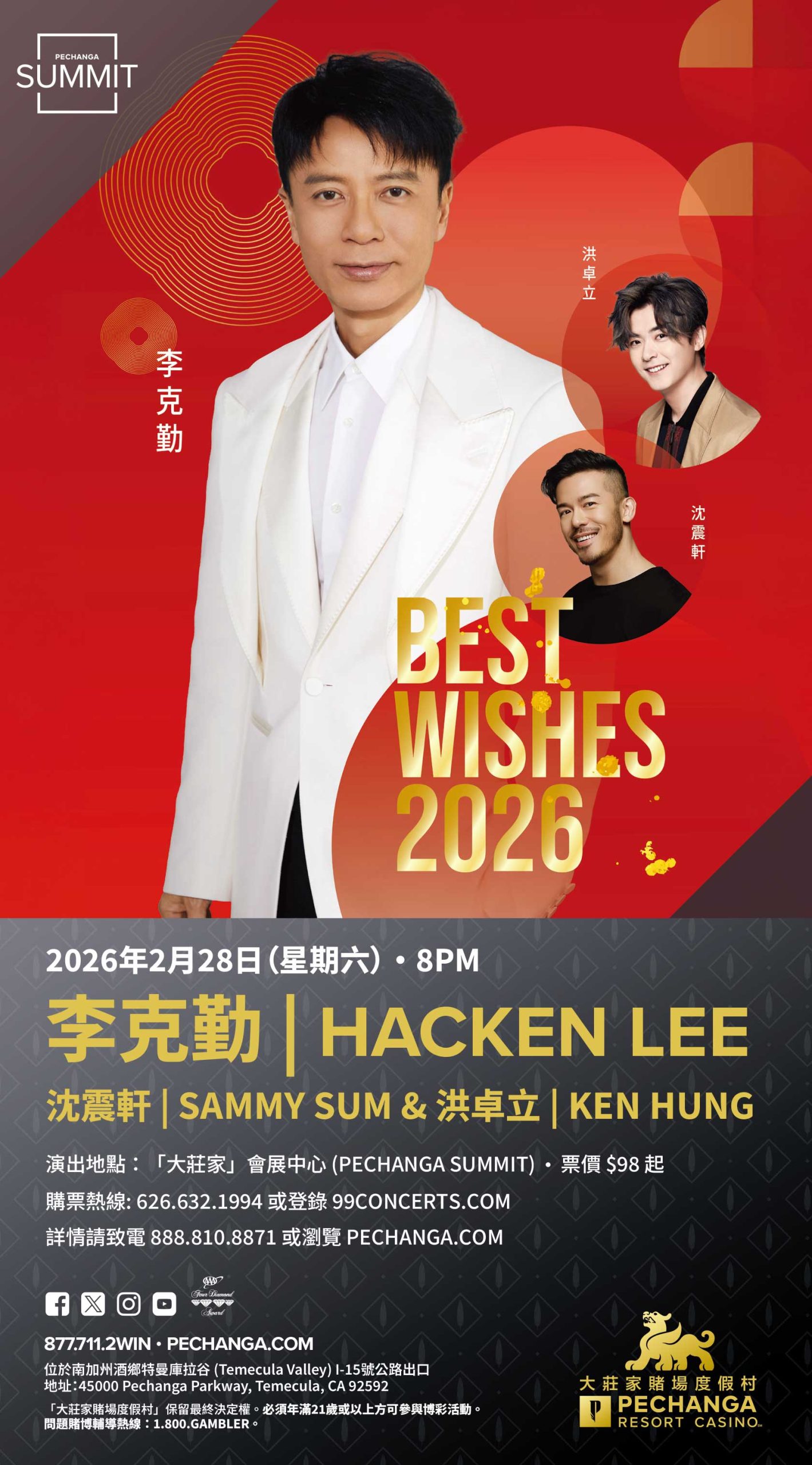 Temecula, CA – Pechanga Resort Casino proudly presents the “Best Wishes” 2026 Concert on Saturday, February 28, 2026, at the Pechanga Summit Events Center. Hong Kong Cantopop superstar Hacken Lee partners with Ken Hung and Sammy Sum as they usher in the Lunar New Year with their timeless classics.